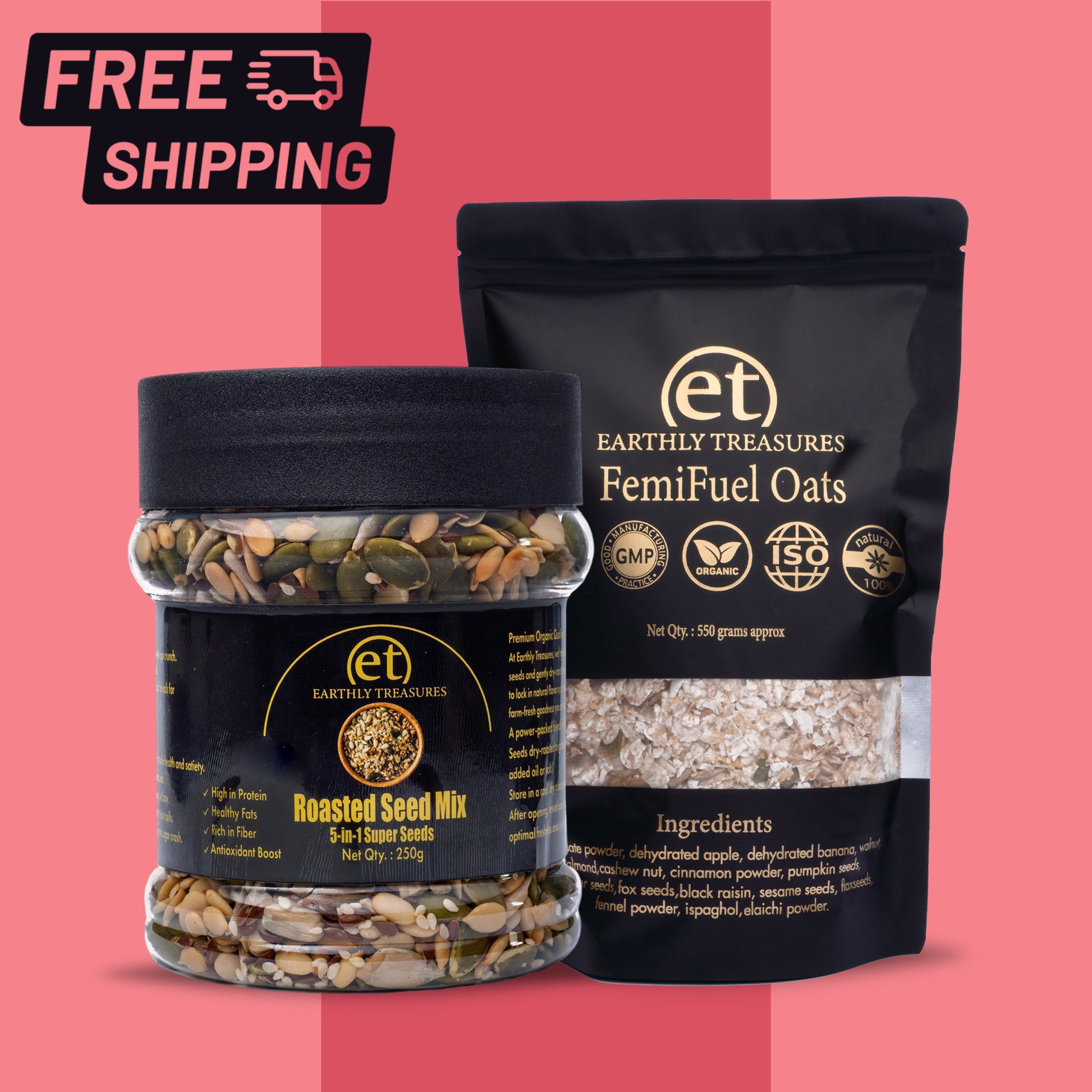 Shine from the inside out with the Femi Glow Bundle. A powerful duo of Femifuel Oats and Roasted Seeds Mix, it’s packed with plant proteins, essential vitamins, and hormone-supporting nutrients. Together, they fuel your mornings, boost vitality, and help you feel radiant every day.